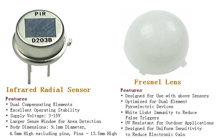 Trên đây là đầu dò PIR, loại bên trong gắn 2 cảm biến tia nhiệt, nó có 3 chân ra, một chân nối masse, một chân nối với nguồn volt DC, mức áp làm việc có thể từ 3 đến 15V. Góc dò lớn. Để tăng độ nhạy cho đầu dò, bạn dùng kính Fresnel, nó được thiết kế cho loại đầu có 2 cảm biến, góc dò lớn có tác dụng ngăn tia tử ngoại.