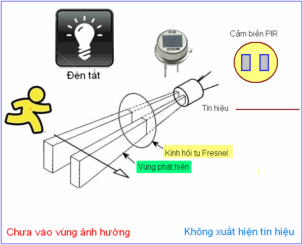 Bạn xem hình động sau đây dùng diễn tả nguyên lý làm việc của đầu dò PIR đối với người qua lại: